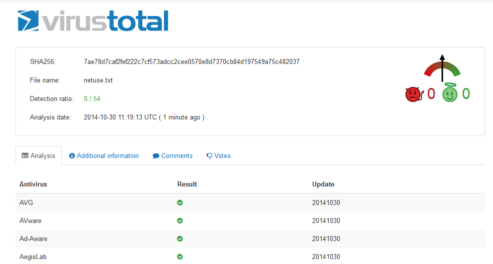Scan files against a lot of Anti Virus engines Posted on October 30, 2014 by Henrik At the moment it scans with 53 engines Virustotal